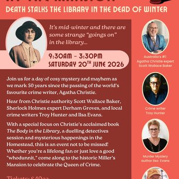 Agatha Christie day at Millers' Homestead, featuring panels and discussions on Christie and The Body in the Library.